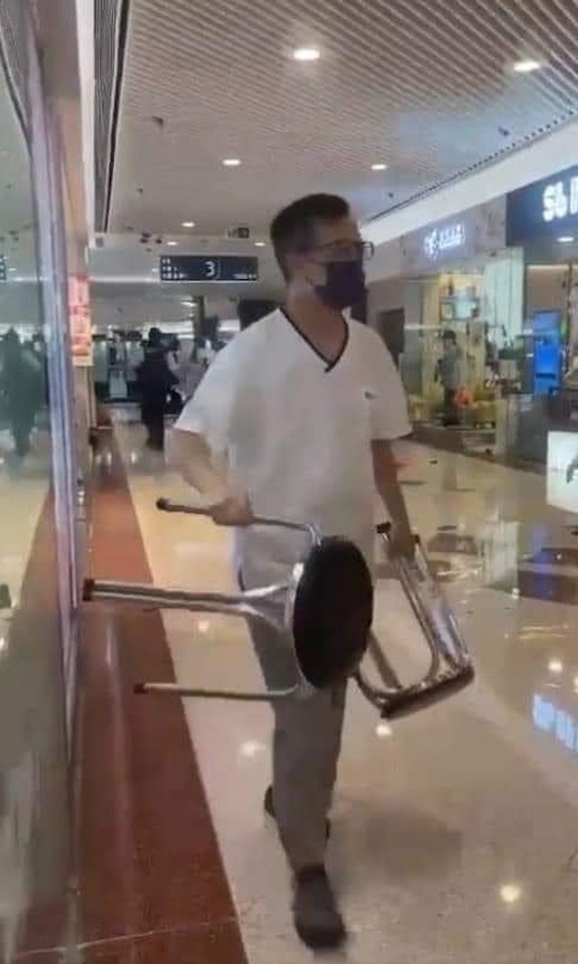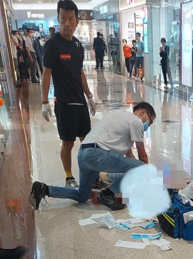 熱心巿民Charles為兩名女子進行急救。網絡圖片 當時,遇襲女子已經沒有脈搏,他向受傷短髮女子施以心外壓,並使用自動心臟除顫器為女子進行電擊。最終兩名遇襲女子都傷重不治,Charles對此感到十分惋惜。他過往亦曾在意外中為人進行急救,但未經歷過如斯嚴重情況。 Charles稱當時不知疑兇原來近在眼前,到後期才意識到與對方相距約10米,兇徒當時仍持刀冷漠地看着現場情況。而他當時眼見傷者十分危急,故沒有理會,只一心一意想救人。Charles事後呼籲大家切勿再轉發相關影片,“我喺現場做case都仲ok,但睇番啲事發片都覺得心寒”。 持凳廚師直面兇徒出手阻擊 另一位被網民大讚神勇的就是那位持凳對峙兇徒的廚師輝哥。據網上流傳片後可見,兇案發生之時,商場走廊“人影都無隻”,但廚師輝哥手持兩張圓凳,挺身而出阻止兇徒繼續傷人,被不少網民稱為真英雄。