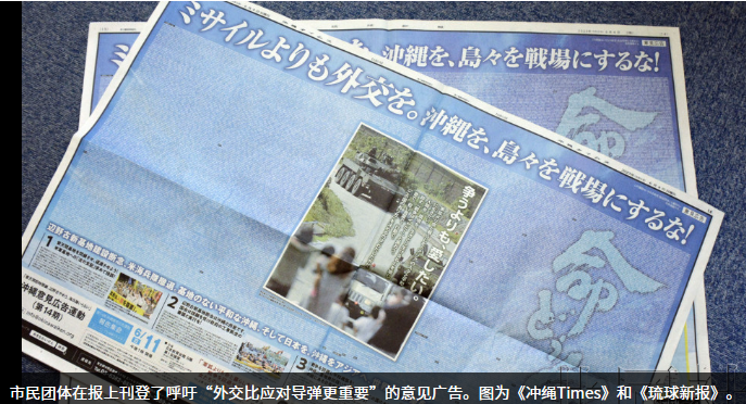 香港新聞網6月5日電 日本衝繩市民團體“衝繩意見廣告運動”4日在報上刊登了意見廣告,呼籲“外交比應對導彈更重要”。