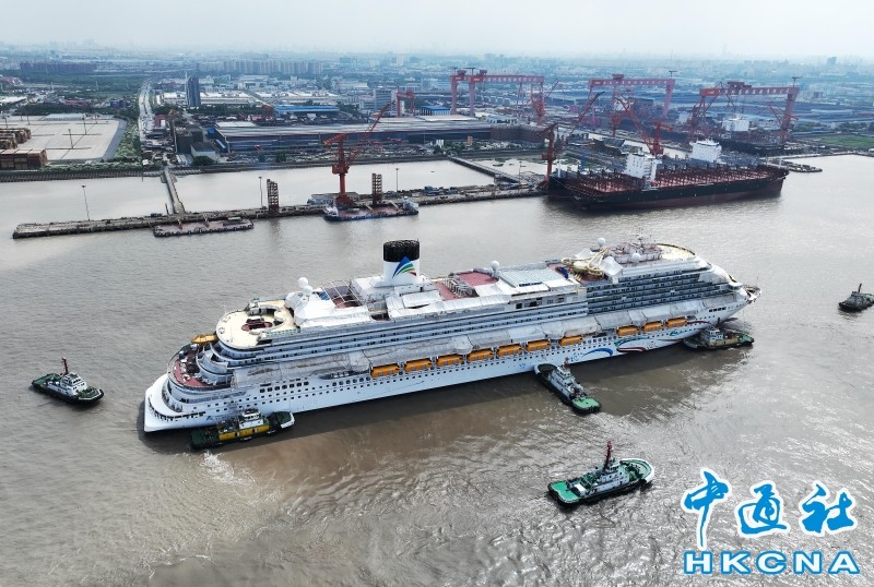 香港新聞網6月6日電 中國首艘國產大型郵輪“愛達·魔都號”6日在上海外高橋造船廠完成塢內系列試驗後順利出塢,全面開啟碼頭繫泊試驗、出海試航和交付的周期。