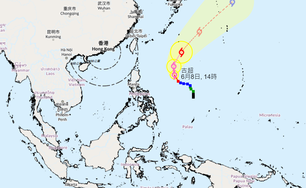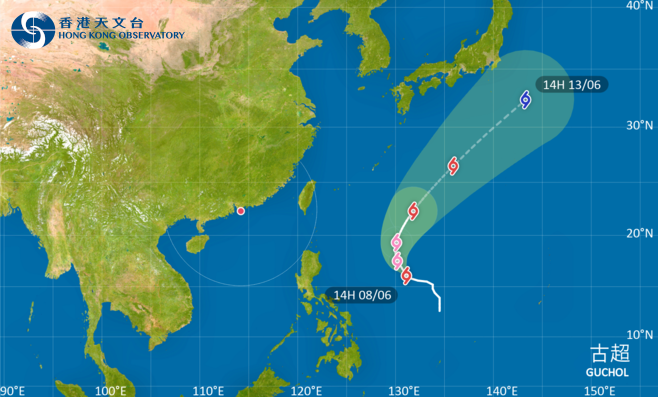 香港新聞網6月8日電 受到兩個低壓系統影響,香港未來九天連續有雨。香港天文台預料,強烈熱帶風暴“古超”會在未來一兩日橫過菲律賓以東海域並繼續增強,周六早上升級至“強颱風”,隨後轉向偏北方向移動,橫過西北太平洋。