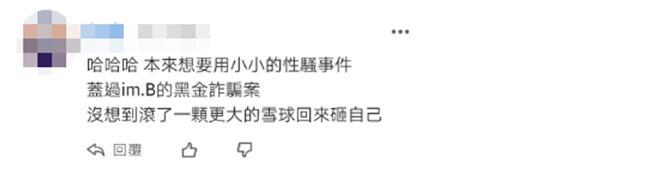 還有人認為,“(民進黨)本來想用性騷擾事件蓋過im.B的黑金詐騙案,沒想到滾了一顆更大的雪球回來砸自己。”↓