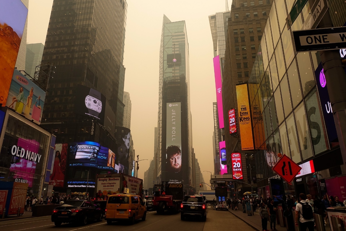 整座城市彷彿被套上一層橘黃色的濾鏡。香港中通社 來到曼哈頓區,遠方的布魯克林大橋被煙霧籠罩,幾乎要看不見,整座城市彷彿被套上一層橘黃色的濾鏡。 肇因是,加拿大發生歷來最嚴重的山火,幾乎所有省和行政區都現災情,其中魁北克省最為嚴重。山火所造成的煙霧,隨風飄入了美國上空,包括紐約市在內發佈了空氣品質警報。