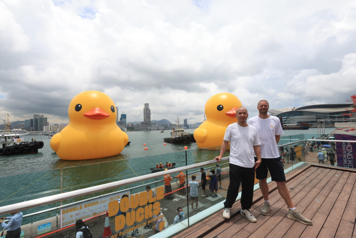 由荷蘭藝術家霍夫曼所創作的巨型黃色橡皮鴨,事隔十年再度訪港。香港中通社 由荷蘭藝術家霍夫曼所創作的巨型黃色橡皮鴨,事隔十年再度訪港!十年過去,這只黃鴨不但“長高”了,由原先的16.5米長到18米,它還有了小夥伴!這次它帶上了自己的同伴來港,逗留至少兩周。 兩隻身高約18米的黃鴨,在維港同遊。霍夫曼早前表示,雙鴨同行代表著好事總成雙,他形容一雙橡皮鴨代表著友誼和與人連結。“疫情讓我們學會珍惜相聚的時光,應活在當下並共創實在的時刻和回憶”。