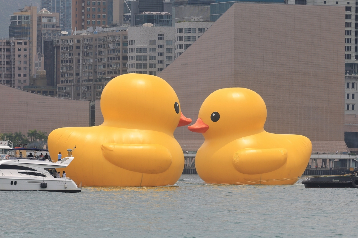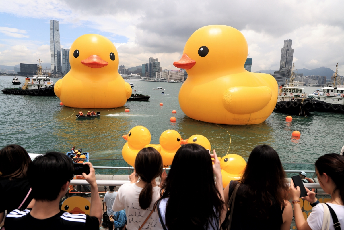 兩只巨型“小黃鴨”在香港正式亮相,吸引了成千上萬市民到場打卡。香港中通社 為了將小黃鴨的快樂傳遞予每位市民,藝術家更特意推出共24款獨特的造型系列的小黃鴨,散佈港九新界18個港鐵車站,並配合金鐘橡皮鴨主題車站,讓公眾體驗這趟藝術旅程。