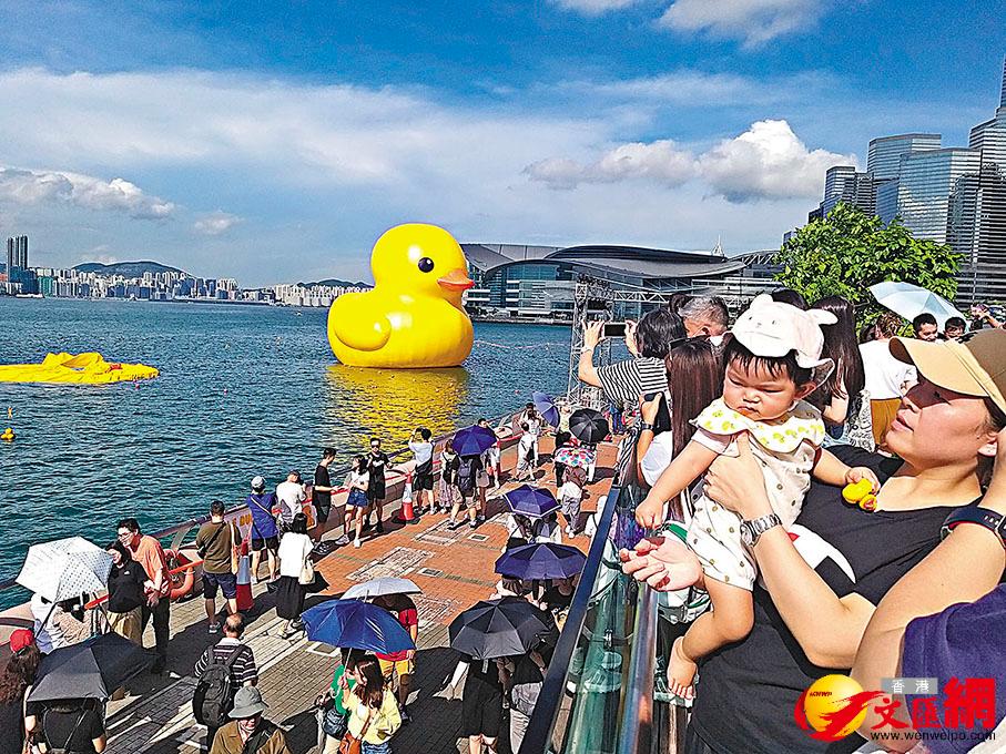 香港新聞網6月11日電 由荷蘭藝術家霍夫曼(Florentijn Hofman)創作的黃色巨型橡皮鴨闊別香港10年,昨日(周六)正式“打孖”兩隻暢遊維港與粉絲們見面,除了吸引大量港人前往“打卡”,也有不少內地及海外旅客慕名而來。 旅游促進會總幹事崔定邦表示,一對橡皮鴨已帶來話題,雖未能估計實際可為香港帶來多少旅游收益,但留意到兩個在內地非常熱門的社交媒體小紅書及微博,已有許多內地人表示要趁這兩周赴港看鴨,相信周末會有較多深圳及廣州的短途客訪港。