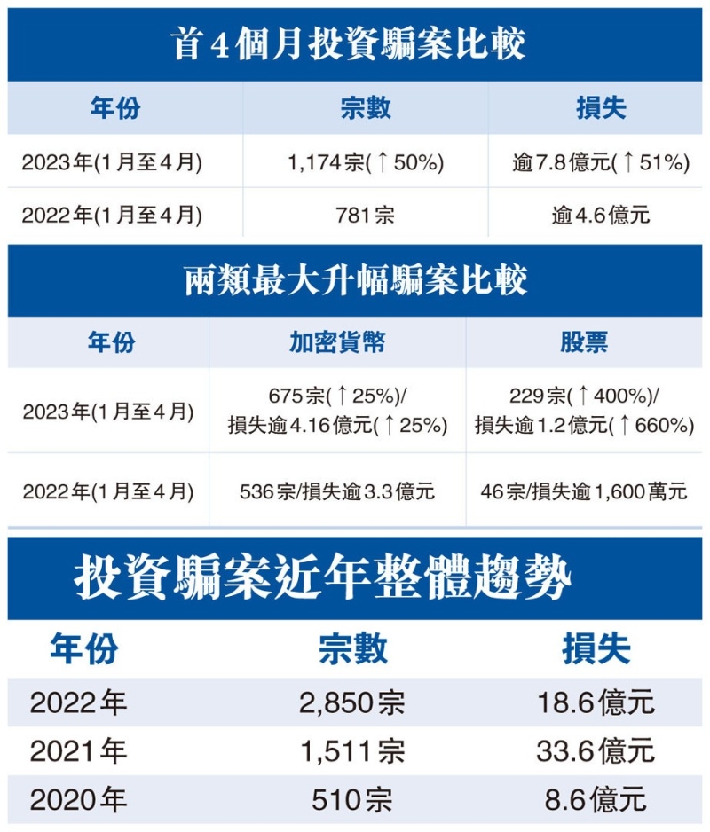 數據來自香港警方。 據香港警方日前公佈的最新投資騙案數據顯示,今年前4個月整體詐騙案件宗數比2022年同期上昇50%,共有1191人受騙。其中,涉加密貨幣騙案有675宗,有677名受害人,涉款逾4.16億元,案件數量及涉款金額比2022年同期均升25%;而股票投資騙案則有229宗,有240名受害人,共涉款逾1.2億元,案件數量及涉款比2022年同期分別上昇4倍和6.6倍。兩者的案件總數,佔今年前4個月整體1174宗投資騙案的近80%,至今警方已經拘捕64名涉案人員。 香港警方提示,騙徒在網上不同社交平台“廣撒網”發送釣魚短訊或廣告,或假扮俊男美女與受害人交友復誘騙投資虛擬貨幣,又或假冒香港著名股評人誘騙投資炒股,實質設立虛假投資平台,玩弄虛假獲利數字促使受害人不斷加碼,最後一鋪清袋,有人因而失去畢生積蓄,連親人遺產都輸掉。(完) 【編輯:許豐悅】