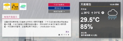 天文台隨後在下午3時再發出另一則局部地區大雨提示,指新界北區的雨勢特別大,並已錄得或預料會有每小時雨量超過70毫米的大雨,有可能出現嚴重水浸。天文台呼籲可能受影響之市民,應採取適當的預防措施,以防止水浸可能引致的損失。大雨可能引致山洪暴發,市民應遠離河道。駕駛人士應注意道路可能出現嚴重水浸及交通擠塞。 天文台預料香港地區下午及今晚大致多雲,有幾陣驟雨及狂風雷暴,部分地區雨勢較大。吹微風。展望未來一兩日雨勢有時頗大及有狂風雷暴。下周初驟雨逐漸減少,天氣炎熱。 (完) 【編輯:孟宜君】