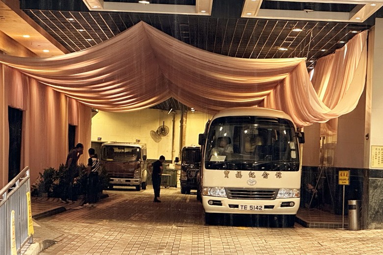 由於蔡天鳳生前喜好粉紅色,故靈堂以粉紅色為主色調,車道亦以粉紅紗帳裝飾(見上圖,圖來自網絡)。 今日上午,陸續有人將花籃、花牌等送到寶福紀念館,其中有不少城中名人送來的花牌,包括蔡天鳳的生前好友方媛及其丈夫郭富城的花牌、以及蔡一智夫婦、樂易玲,以及相信是郭富城經理人小美(原名梁美薇)的花牌。