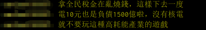 還有人稱,“拿全民稅金在亂燒錢,這樣下去一度電10元也是負債1500億啦,沒有核電就不要玩這種高耗能產業的游戲。” ↓