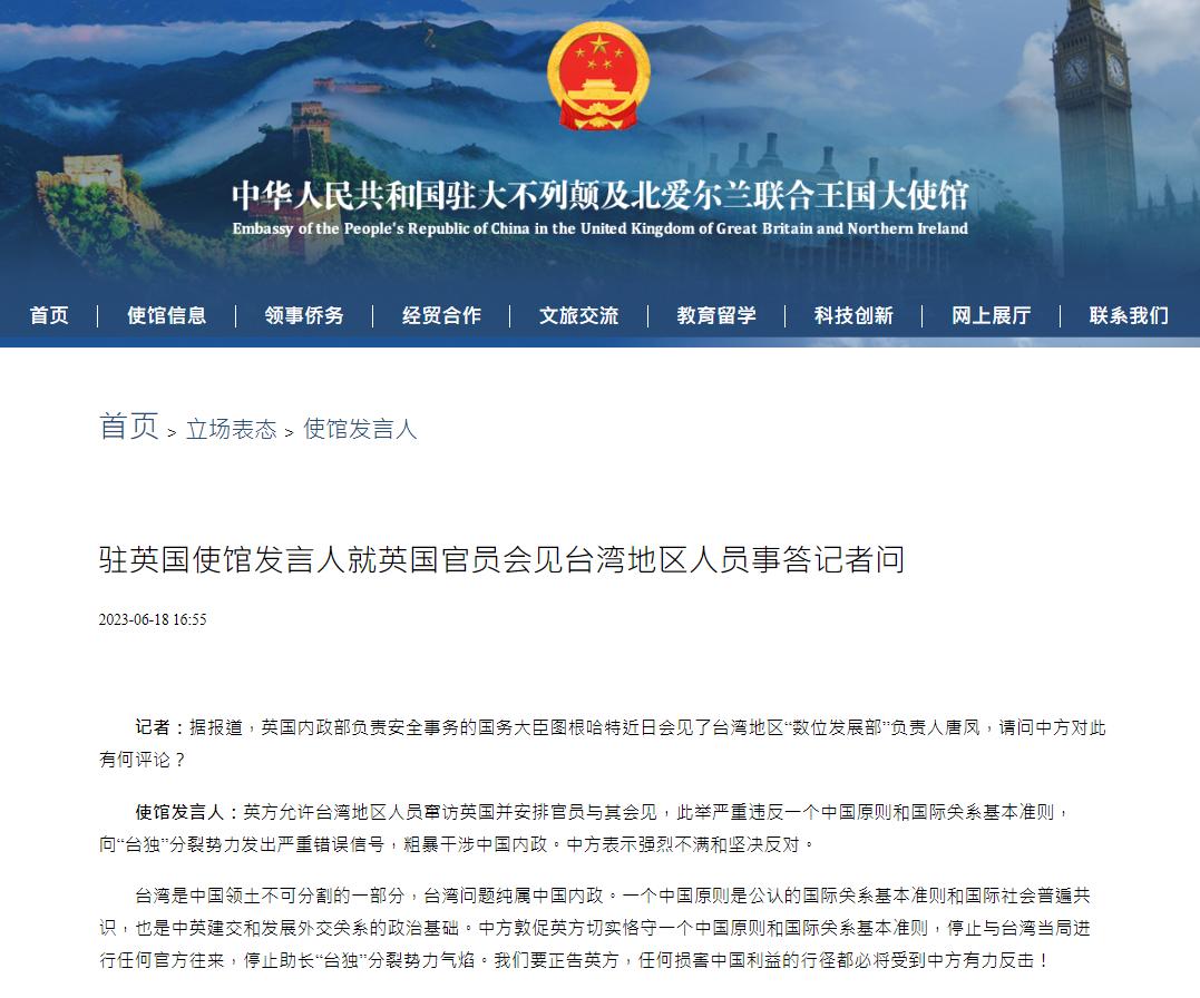 香港新聞網6月19日電 據中國駐英大使館公佈,英國內政部負責安全事務的國務大臣圖根哈特近日會見了台灣地區“數位發展部”負責人唐鳳。中國駐英大使館發言人回應表示,英方允許台灣地區人員竄訪英國並安排官員與其會見,此舉嚴重違反一個中國原則和國際關係基本準則,向“台獨”分裂勢力發出嚴重錯誤信號,粗暴干涉中國內政。中方表示強烈不滿和堅決反對。