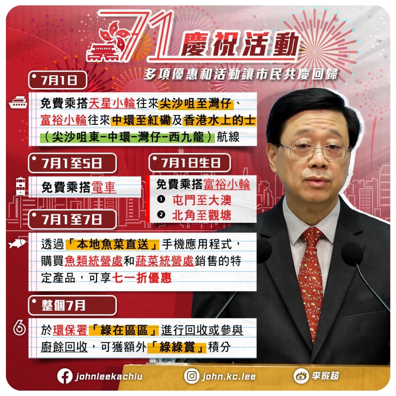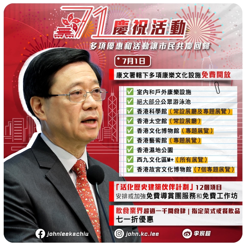 李家超FB圖片。 他續說,為了延續開心氣氛及慶祝香港回歸,特區政府將聯同公營機構於七月推動各項活動,亦鼓勵各界舉辦慶祝回歸活動。當中包括,七一當日可以免費使用康文署設施、絕大部分的公眾游泳池、免費開放科學館、香港濕地公園、太空館常設展覽、西九龍M+及故宮文化博物館的7個展覽廳。而在七一期間,一連七日手機應用程式“本地魚菜直送”購買漁農產品有優惠;環保署的“綠在區區”亦提供額外積分。 另外,七月一日起一連五日市民可以免費乘搭電車;七一當日市民可以免費乘搭天星小輪和電車,亦有約1,000間食肆的指定菜式及飲品於七一當日會提供七一折優惠,詳情稍後會再作公布。 (完) 【編輯:孟宜君】
