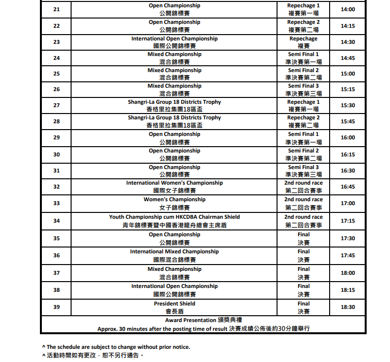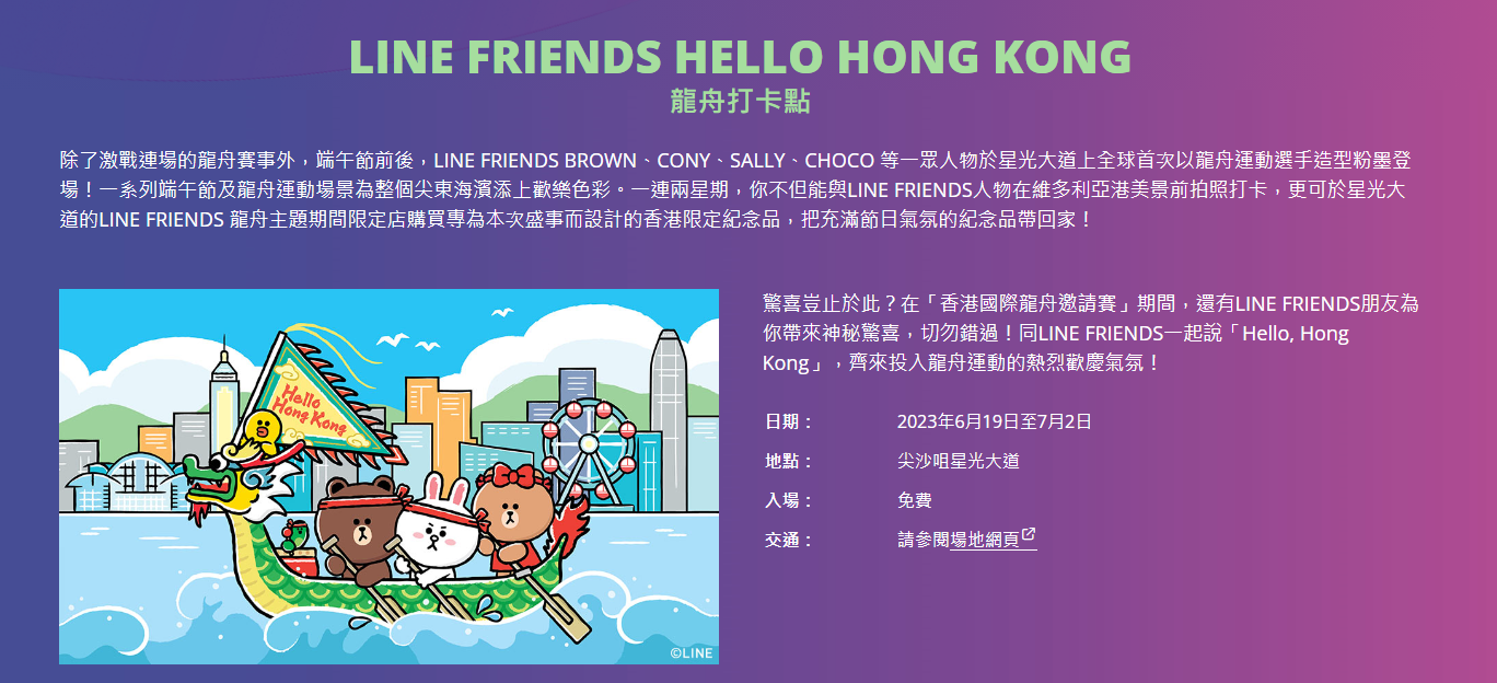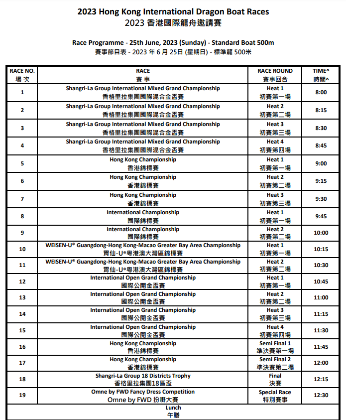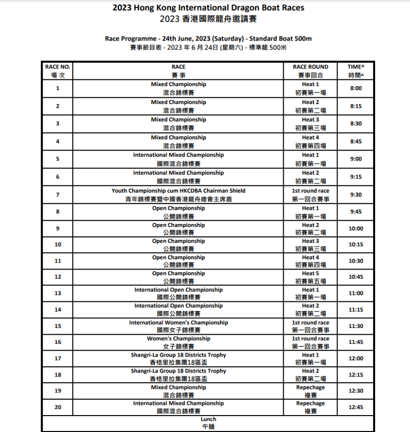比賽賽程。中國香港龍舟總會圖片 今年的香港國際龍舟邀請賽在周末舉行,市民可前往尖沙咀東部海濱觀賞賽事,當中包括非本地隊伍參加的國際公開、混合及女子國際錦標賽,本地公開、混合、女子組,還有24歲以下隊伍參加的青年錦標賽暨中國香港龍舟總會主席盾賽。另外,龍舟隊伍更會以怪趣打扮參加“扮嘢大賽”,炒熱現場氣氛。 除此之外,尖沙咀星光大道亦設置了“LINE FRIENDS Hello Hong Kong龍舟打卡點”,LINE角色以不同形態化身成龍舟選手,供市民在維多利亞港美景前拍照打卡。 (完)