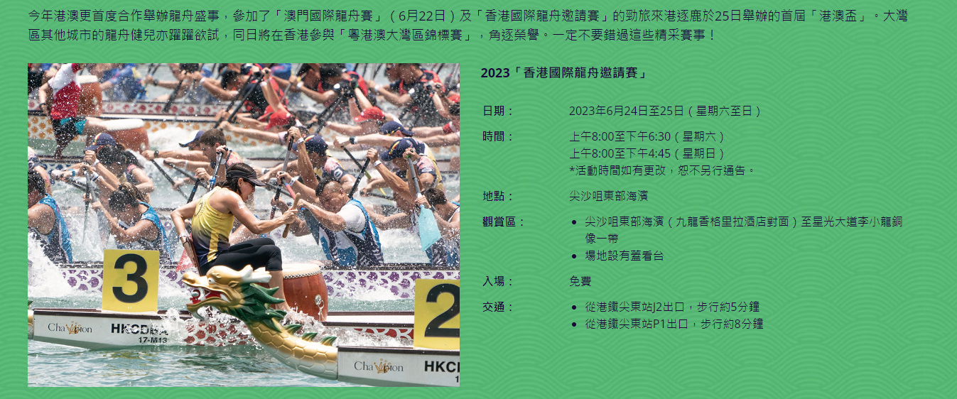 比賽地點及時間。香港旅發局圖片 其中正在備戰杭州亞運的香港龍舟代表隊,亦將出戰今年的香港國際龍舟邀請賽。總教練伍新成近日接受媒體訪問時表示,港隊訓練的時間較短,將會主攻水上訓練,希望能夠從今次比賽中累積更多經驗,目標是晉級決賽,為世錦賽、亞運會創造更多條件。 至於未來兩日天氣不穩,伍新成指不會擔心,直言端午節是龍舟水,平日的訓練都要適應這種狀態。特別端午節經常在大風大雨中比賽,必須適應這種惡劣的環境。 港隊成員鄧淏聰在訪問中就坦言自己最怕遇到大浪,平日在城門河訓練時水面較為平靜,擔心比賽當天在尖東海濱海面的風浪會較大,部分隊員會不適應,同時亦因為緊張而令身體變得不穩定,影響平衡。因此要調整心態,令每個隊員都能冷靜下來。