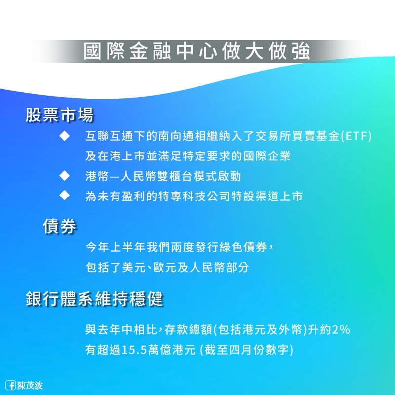 陳茂波:香港加速向前 迎更美好明天香港新聞網6月25日電 香港特區政府財政司司長陳茂波今日(25日)發表網誌,回顧今屆政府上任一周年的工作及心情。他指出,香港在發展過程中面對不少挑戰和困難,很多經年累積的問題也需要時間化解。不過,就如行政長官所言,特區政府整個團隊、行政立法關係、社會各界更為團結,本港經濟發展正面。在持續努力、加速向前的階段,香港必定迎來更美好的明天。 陳茂波指出,過去300多天與港人一起經歷高低起伏,見證了整個社會如何擺脫疫情、步入復常,毋須再戴口罩的生活讓大家笑臉重現。從去年底的國際金融領袖投資峰會、七人欖球賽;到今年初香港全面復常,“開心香港”的美食市集系列,以至近期闊別十年的黃鴨仔重臨維港,都為不少大人和小朋友帶來歡笑與回憶。