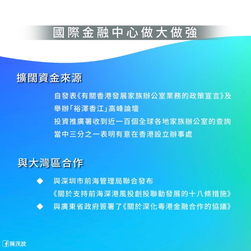 陳茂波網誌圖片。 他強調,開闢新賽道,才能有跨越式增長。新一屆政府提出將香港打造成為國際綠色科技及綠色金融中心,就是希望讓香港憑藉在這兩個範疇已具備的優勢,在這龐大的國際新市場中搶佔領導位置。而這也是以香港所長、服務國家所需,並對應不斷增加的國際需求。有統計指,單在未來30年,亞洲地區便需要66萬億美元的氣候投資,還有不同產業鏈的企業設備更新等,足見市場對綠色科技應用和綠色金融的龐大需求。 創新科技方面,陳茂波指,過去這一年,特區政府更大力的透過新政策、新舉措、新模式,全速推動本港在創新科技的研究、科研成果的轉化和應用。行政長官去年在《施政報告》中提出的“搶人才”、“搶企業”的工作已全面展開,這些都是從策略層面提出的有力舉措,推動創科龍頭或技術前沿的企業落戶香港,匯聚更多人才,並創造蓬勃的生態圈和產業集群。至於“香港投資管理有限公司”已收到不少機構提交的投資計劃書,並與這些機構開展洽談。可以說,本港在創新科技方面的發展已更為社會所認同和支持,未來是加速向前的階段。