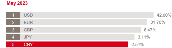 與2023年4月相比,人民幣支付金額總體增加了20.38%,同時所有貨幣支付金額總體增加了8.75%。 此外,以歐元區以外的國際支付作為統計口徑,當月人民幣位列第六,佔比1.51%。