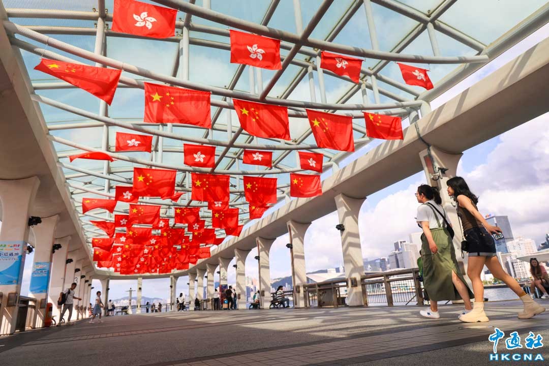 6月21日,香港中環一碼頭掛滿了中華人民共和國國旗和香港特區區旗,吸引了大批遊人打卡。今年7月1日是香港回歸祖國26周年,近期香港大街小巷一片喜慶。(香港中通社記者 許其皓攝)