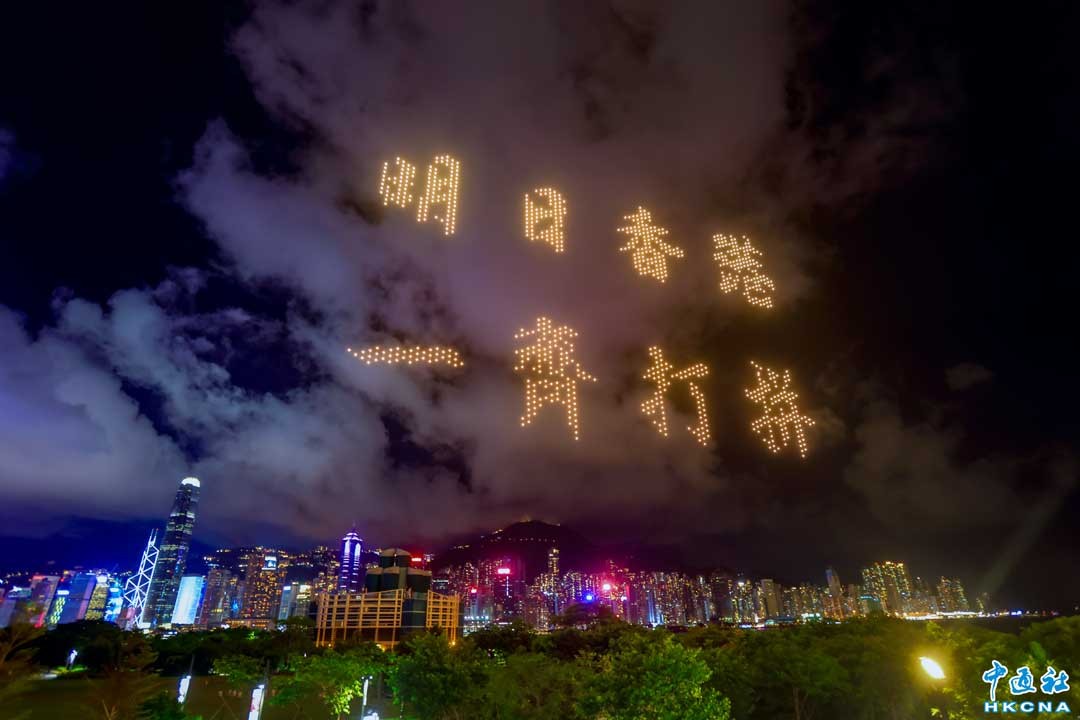6月22日,“紫荊花之夜”大型無人機表演活動在香港西九文化區舉行,現場逾千架無人機以創意秀的形式,呈現屈原、楚辭、五彩線等節日意象,祝福香港市民端午安康,並以無人機排列吃粽子、放風箏、賽龍舟等端午活動民俗活動,最終在巨龍托起東方之珠、海陸空呈現維港夜景的恢宏畫面中達到高潮, 結尾處呈現“明日香港,一齊打拼”的點題之筆。(香港中通社記者 曹文毓攝)