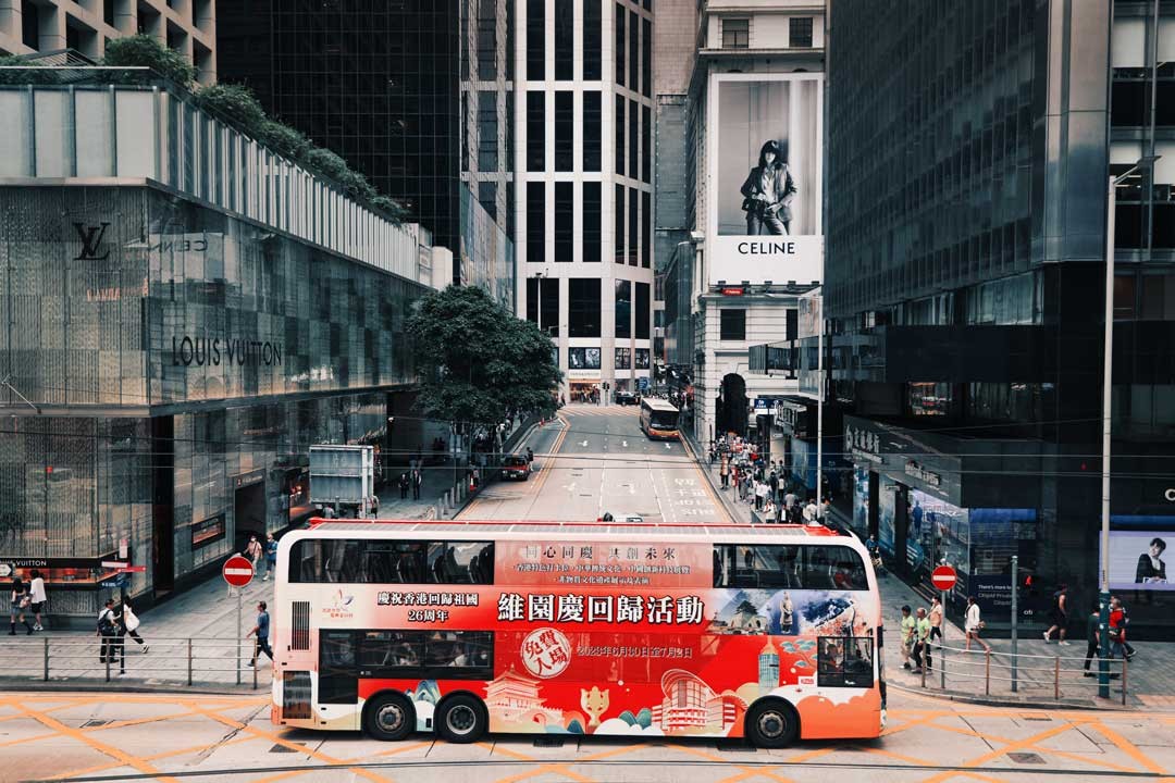 6月23日,香港一輛慶祝香港回歸祖國26週年廣告的巴士行駛過中環街頭。今年7月1日是香港回歸祖國26週年紀念日,近日香港街頭一片喜慶。 (香港中通社記者 許其皓攝)