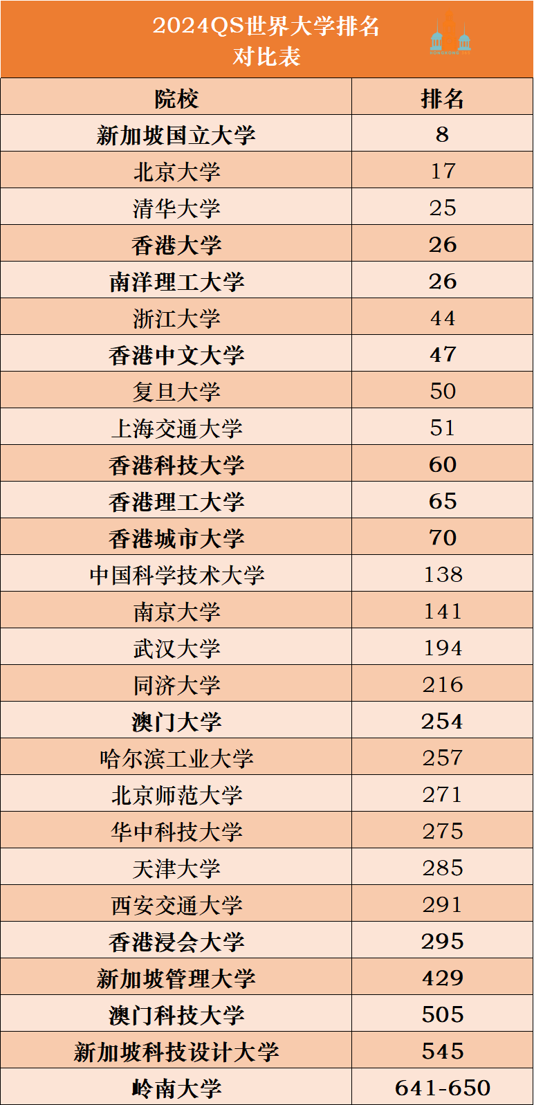 資料來源:QS網站 北京大學是中國內地高校中唯一一所位於全球前20的院校,排名全球第17位。 令人驚訝的是,澳洲高校--新南威爾士大學和悉尼大學擠掉了以往我們熟悉的幾所英國高校和新加坡高校。比如愛丁堡大學和南洋理工大學 ,今年已不再前20行列。 中國香港高校表現 今年年初,QS宣布要調整排名標準後,有人曾預測中國香港高校會因此名次下滑。結果如何? 本次排名,中國香港地區共有7所大學上榜,其中有5所打入全球前100位。香港大學下降5名,排全球第26,仍然位列香港高校首位。往年的港校第二和第三,今年沒有變化。香港中文大學和香港科技大學分別排在全球第47和第60。兩者均下降明顯,尤其是科大,直接跌出全球前50。香港理工大學成為本次排名唯一沒有下降的港校,排在全球第65。 香港城市大學下降16名,排全球第70。香港浸會大學也較去年下降14位,排全球第295名。嶺南大學排名也有下滑,排在全球第641-650。 我們梳理一下總排名,看今年中國香港高校與中國內地高校、中國澳門高校和新加坡高校放在一起整體情況如何?