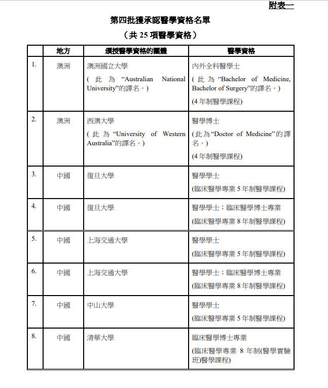 第四批獲承認醫學資格名單將於6月30日刊憲,同日生效,并將於7月5日提交立法會進行先訂立後審議的程序,連同首三批於去年公佈的醫學資格名單,注委會至今合共建議承認100項醫學資格。 據法例要求,持認可醫學資格的非本地培訓醫生,如符合相關條件可申請特別註册途徑來港,於公營醫療機構(即醫管局、衛生署、香港大學和香港中文大學)擔任醫生工作,并在服務一定年期,取得認可專科資格及通過評核後獲得正式註册在港執業行醫。 醫務衛生局局長盧寵茂相信,新一批名單公佈有助香港引入非本地培訓醫生,又指新納入名單的內地院校課程,大部分都以中英文雙語教學,部分是英語教學。
