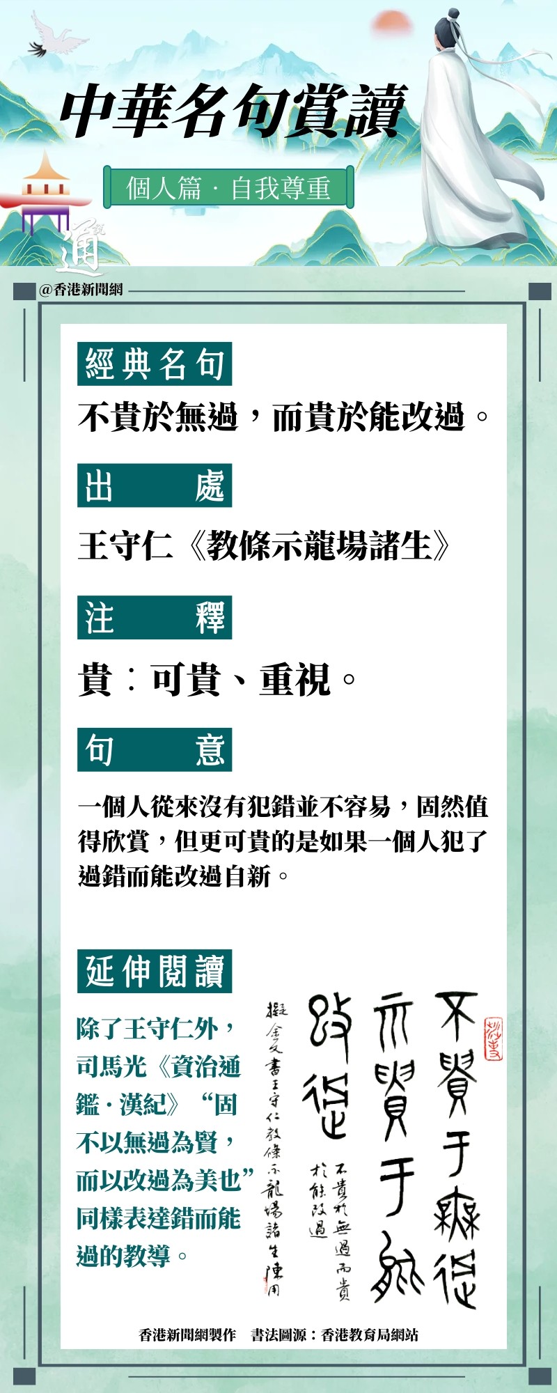 香港新聞網7月4日電 要成功,就要經得起挫折。古代很注重個人的修養,特別看重“錯而能過”。為加強中國文學和文言經典的學習,香港特區政府教育局繼續開展“中華經典名句推廣活動”,從《致知達德》(中華傳統美德語文學習資源)中選取40則名句,作為本學年推廣的內容。 香港新聞網推出“中華名句賞讀”系列,涵蓋自我尊重、認真負責、勤奮堅毅、尊重別人、心繫祖國等多個主題。今日分享“自我尊重”主題之“不貴於無過,而貴於能改過”,出自王守仁《教條示龍場諸生》。