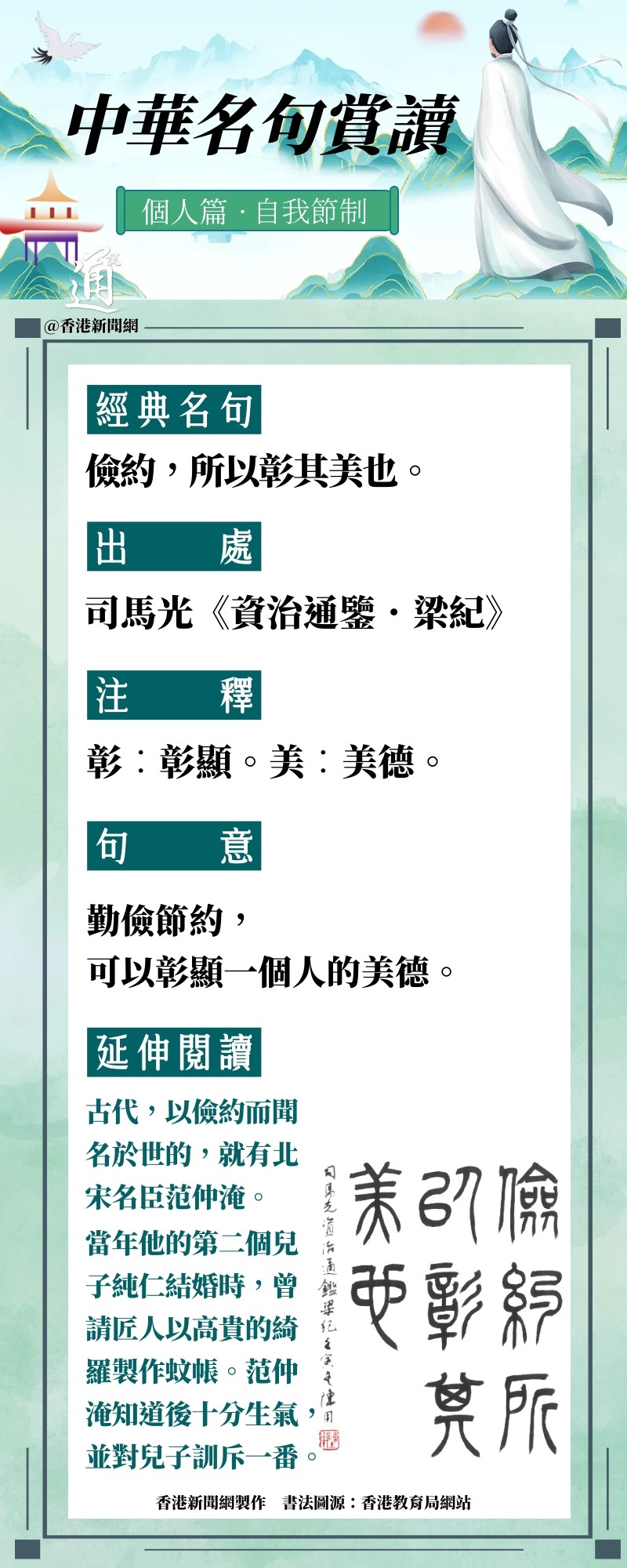 香港新聞網7月10日電 節儉是中國傳統美德。在古代,以儉約而聞名於世的,就有北宋名臣范仲淹。范仲淹曾對兒子說過:“我最不願意的,是看着等安享父官的富貴俸祿。” 為加強中國文學和文言經典的學習,香港特區政府教育局繼續開展“中華經典名句推廣活動”,從《致知達德》(中華傳統美德語文學習資源)中選取40則名句,作為本學年推廣的內容。香港新聞網推出“中華名句賞讀”系列,涵蓋自我尊重、認真負責、勤奮堅毅、尊重別人、心繫祖國等多個主題。今日分享“自我節制”主題之“儉約,所以彰其美也”,出自司馬光《資治通鑒.梁紀》。