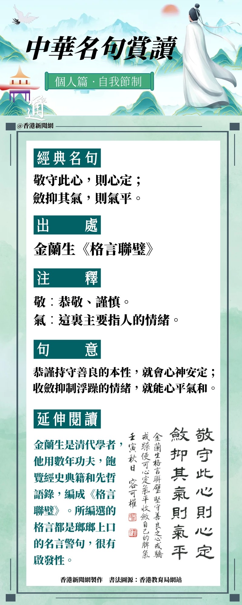 為加強中國文學和文言經典的學習,香港特區政府教育局繼續開展“中華經典名句推廣活動”,從《致知達德》(中華傳統美德語文學習資源)中選取40則名句,作為本學年推廣的內容。香港新聞網“中華名句賞讀”系列,今日分享古書中的“敬守此心,則心定;斂抑其氣,則氣平”。此句出自金蘭生《格言聯璧》。