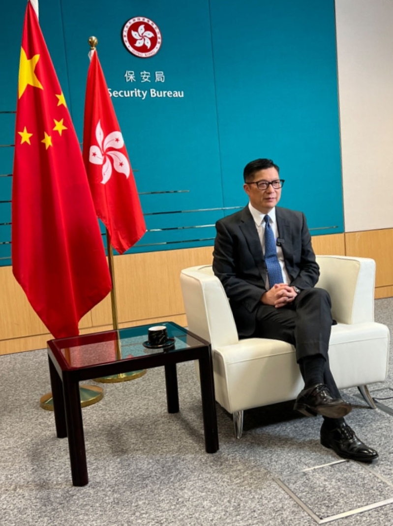 香港特區政府保安局局長鄧炳強獨家接受香港中通社、香港新聞網專訪。香港中通社圖片 講好香港故事,是過去一年特區政府的重要工作,鄧炳強今年曾先後到訪北京及粵港澳大灣區。訪京期間他到天安門,時隔四年再觀升旗禮。 他告訴記者,以身為中國人而感到驕傲,深深感受到國家正邁向社會主義現代化強國的新征程。國家的發展一日千里,特別在應用科技上,進步神速,值得香港學習。 安全兩字,是專訪中鄧炳強談得最多的。 “香港國安法實施三年,完善了選舉制度,落實了愛國者治港,接下來將完善地區治理。”鄧炳強說,落實“愛國者治港”原則後,特區政府部門不需要再花無謂的時間應對議會的破壞性行為,可以集中精神為市民做得更好。 他談到香港基本法23條立法,透露正檢視哪些行為是香港國安法和現行法例未有涵蓋,包括注意間諜活動和網絡方面缺口,以制定有效和務實的方案和條文。 早前香港接連發生令社會非常關注的暴力罪案。鄧炳強說,理解市民的不安,警方會全天候從多方面著手防止和打擊各類型罪案,透過靈活調配資源加強高調巡邏,令香港繼續成為世界上最安全的城市之一。