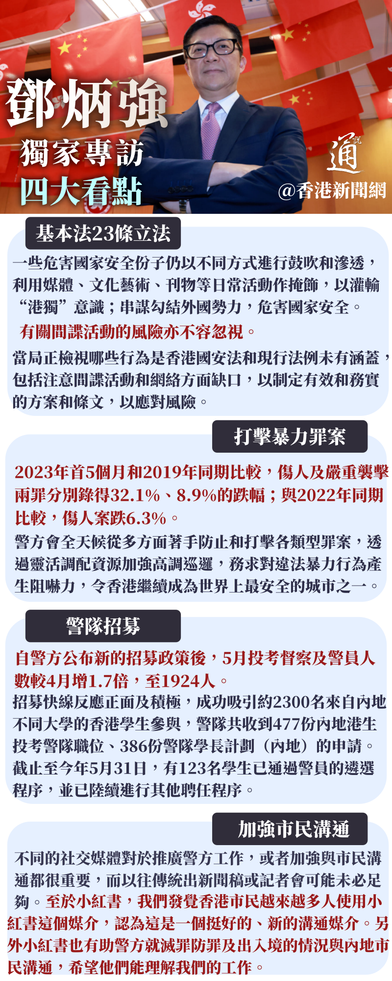 香港新聞網6月30日電 香港特區政府保安局局長鄧炳強6月30日獨家接受香港中通社、香港新聞網專訪。當中他談及四大看點,分別是香港基本法23條立法、打擊暴力罪案、警隊招募工作,以及加強與市民溝通。戳圖看看他怎麼說。↓
