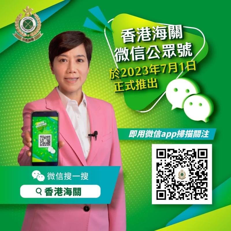 繼開設YouTube頻道、Facebook專頁、Instagram帳戶及抖音官方帳號後,海關開設微信官方帳號,作為第5個社交媒體官方平台,進一步加強海關與公眾的溝通和聯繫。海關會利用微信官方帳號發布部門多元化的工作和最新資訊,接觸更多香港及內地民眾,推廣海關專業形象,並讓公眾掌握更多有用的海關資訊。 海關關長何珮珊特别為此拍攝宣傳短片作開通序幕,有關短片已上載“香港海關”微信官方帳號。歡迎公眾透過二維碼瀏覽、關注及分享“香港海關”微信官方帳號的資訊。 (完) 【編輯:徐嘉儀】