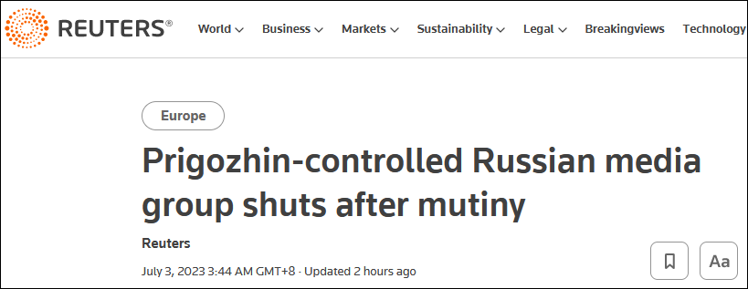 路透社報道截圖 俄羅斯聯邦新聞通訊社負責人祖巴列夫當地時間7月1日,在社交媒體賬戶上發佈視頻宣布了關閉機構並離開該國的決定。對於關閉媒體集團的原因,祖巴雷夫并沒有給出具體的說明。 祖巴列夫在他的視頻中,讚揚了愛國者傳媒集團的行動,稱該媒體站在維護普里戈任以及俄總統普京的立場,使他們免受反克里姆林宮人士的攻擊。