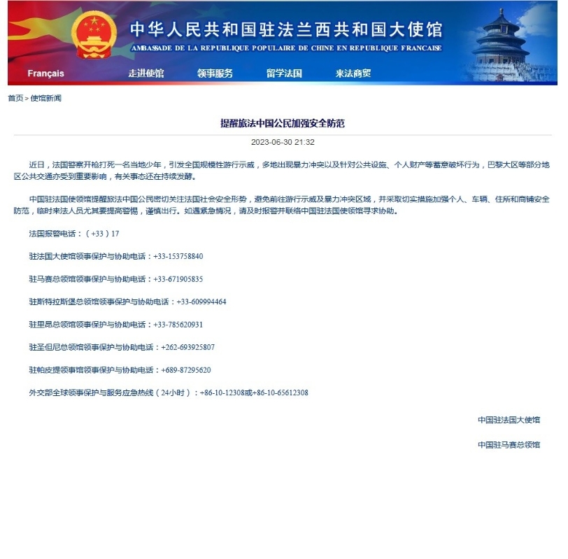 (法國騷亂持續。香港中通社資料圖) 中國駐法國大使館亦發表聲明,提醒旅法中國公民加強安全防範。 聲明說,近日法國警察開槍打死一名當地少年,引發全國規模性遊行示威,多地出現暴力衝突以及針對公共設施、個人財產等蓄意破壞行為,巴黎大區等部分地區公共交通亦受到重要影響,有關事態還在持續發酵。 中國駐法國使領館提醒旅法中國公民,密切關注法國社會安全形勢,避免前往遊行示威及暴力衝突區域,並採取切實措施加強個人、車輛、住所和商鋪安全防範,臨時來法人員尤其要提高警惕,謹慎出行。如果遇到緊急情況,應及時報警並聯絡中國駐法國使領館尋求協助。
