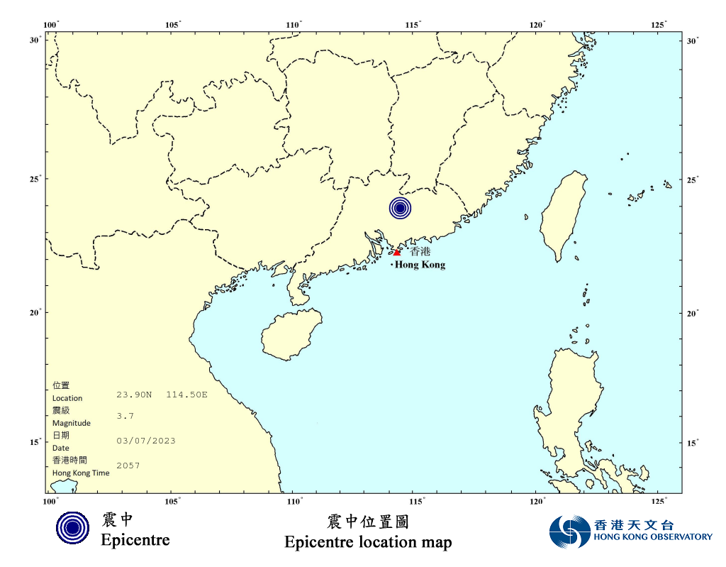 香港天文台圖片。 據香港天文台的初步分析,地震發生在河源之西北偏西約23公里,震源深度約9公里。 香港天文台接獲超過十名市民報告,表示感到輕微震動,震動維持數秒。初步分析顯示,香港的地震烈度為修訂麥加利地震烈度表的第三度,即室內有感,類似小型貨車駛過的振動。(完) 【編輯:孟宜君】