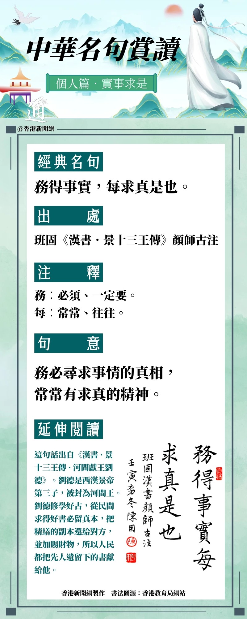 香港新聞網7月24日電 如果有人做事態度認真,又有求真的精神,我們會讚美這人做事“實事求是”,是一位能幹可靠的人。 在古聖言上,有一句更文雅的語句來形容,就是“務得事實,每求真是也”,出自班固《漢書 · 景十三王傳》,由顏師古作注而得出這優美的釋文。這句話意思就是務必尋求事實的真相,常常有求真的精神。為加強中國文學和文言經典的學習,香港特區政府教育局繼續開展“中華經典名句推廣活動”,從《致知達德》(中華傳統美德語文學習資源)中選取40則名句,作為本學年推廣的內容。香港新聞網“中華名句賞讀”系列今日解讀名句“務得事實,每求真是也”。