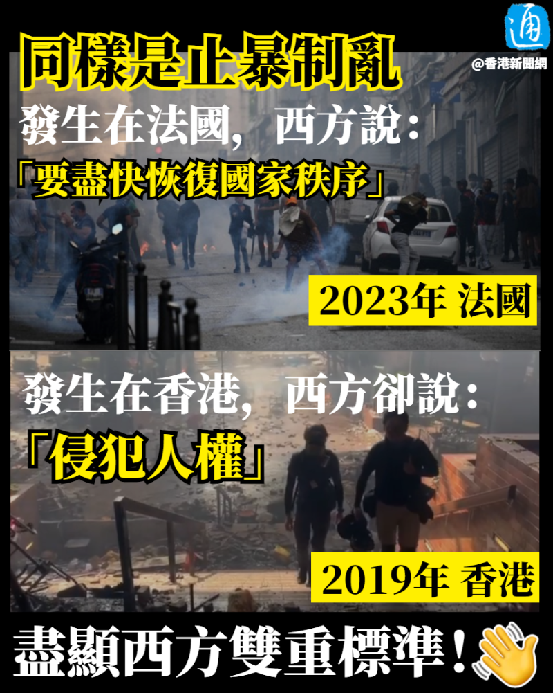 香港新聞網7月5日電 法國連日發生大規模騷亂,暴徒到處打砸搶燒堵路,一幕幕汽車被燒火光熊熊、商店被破壞搶劫的場面,與2019年香港黑暴的暴行何其相似,然而西方國家的反應卻迥異。