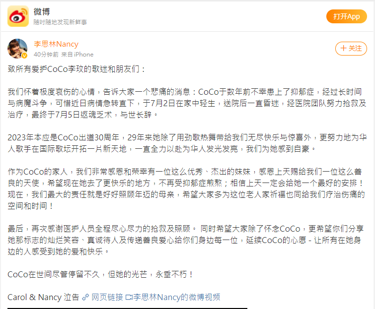 香港新聞網7月5日電 據李玟的二姐李思林5日晚間在新浪微博發文公佈,李玟CoCo於數年前不幸患上了抑鬱症,經過長時間與病魔鬥爭,可惜近日病情急轉直下,於7月2日在家中輕生,送院後一直昏迷,經醫院團隊努力搶救及治療,最終於7月5日返魂乏術,與世長辭。終年48歲。
