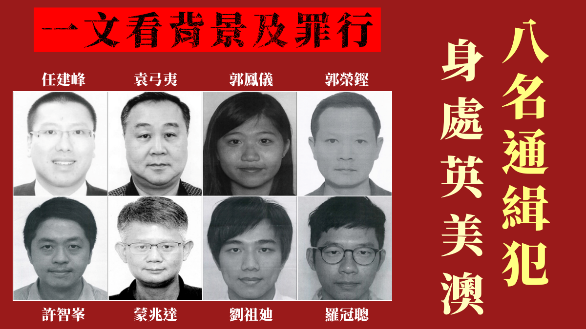 8名被通緝人士。警方圖片 據報,被捕4名男子,年齡介乎26歲至28歲,均為前“香港眾志”骨幹成員,當中包括林朗彥、李啟靖等。有人透過一家顧問有限公司於幕後營運反政府“懲罰mee”的社交平台及手機應用程式,並租用葵涌永建路一工廈單位作辦公室。期間多次透過相關社交平台持續發布具有煽動意圖的訊息,並售賣煽暴煽“獨”的物品以進行籌款,再將資金支援羅冠聰在海外進行反華活動。