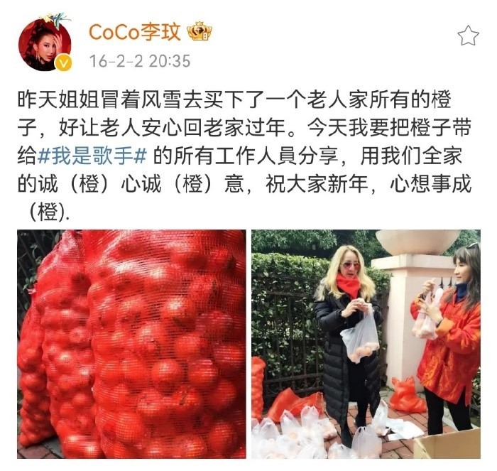 圖源:上游新聞 亦有網友回憶,李玟生前曾幫7旬老人賣橙,助老人安心回家過年。2016年,有志願者在長沙做公益活動時,看到一位76歲老人冒雪在馬路邊賣橙,短時間內難以賣完回家過年。 李玟得知這個消息後,委託自己媽媽和姐姐到賣橙現場購買幾十袋橙子,並捐了2000元現金給老人,同時利用上節目的機會呼籲更多人前往購買。她的愛心當時感動了許多人,也成功在一天內解決了老人的難題。