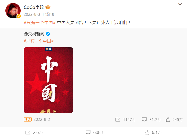 視頻截圖 同年美國眾議院時任議長佩洛西竄台時,李玟在微博轉發“世界上只有一個中國”的貼文,更特別發文寫道:“中國人要團結!不要讓外人干涉咱們!”