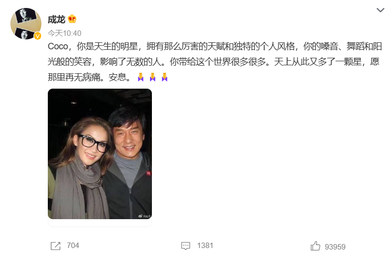 社交媒體截圖 李玟這一生,善助他人,心懷國家,為世界留下了很多愛與溫暖。 香港演員成龍今日(6日)發文悼念李玟:“CoCo,你是天生的明星,擁有那麼厲害的天賦和獨特的個人風格,你的嗓音、舞蹈和陽光般的笑容,影響了無數人。你帶給這個世界很多很多。天上從此又多一顆星,愿那裡再無病痛。安息。”