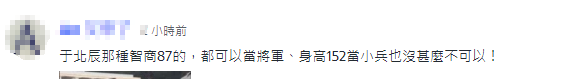 有台灣網友則調侃稱,滿嘴跑火車的于北辰(曾以“三發導彈攔截率210%”遭到兩岸群嘲)都可以當將軍,身高152公分當小兵也沒甚麼不可以!