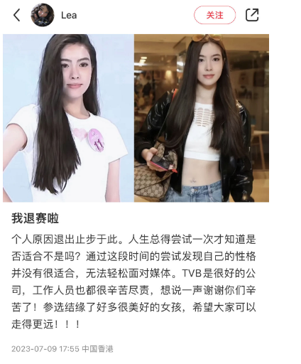 香港新聞網7月10日電 《2023香港小姐競選 終極面試》昨晚播出(9日)最後一集,經過一輪終極挑戰後,最終有18位佳麗成功晉級。不過,其中一位晉級佳麗賀怡雯(Lea)當日下午在社交平台小紅書宣布因個人原因退賽。香港新聞網今日(10日)翻查無線的“一見鍾意佳麗”網站,發現亦已無佳麗賀怡雯(Lea)的照片。