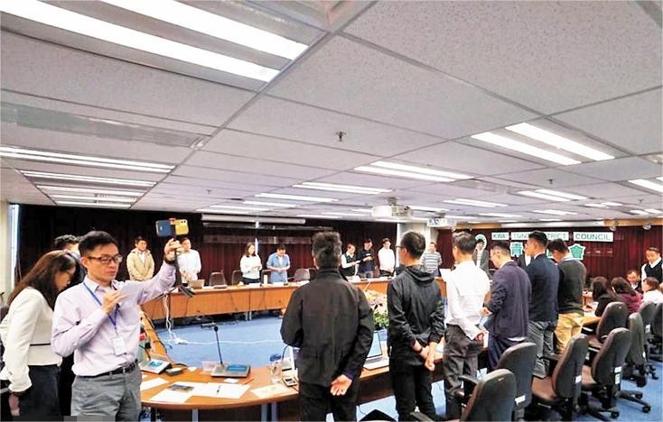 有反中亂港在會議期間唱“港獨”歌曲。香港文匯網圖片 而根據《區議會條例》第61條可見,其職能並不具立法或審批政府公共開支的權力,僅屬於地區事務諮詢機構。多年來,區議會一直擔任市民與特區政府之間的“橋梁”,然而在2019年“黑暴”期間,區議會性質出現徹底變化,嚴重偏離和違反區議會職能,被反中亂港人士利用做出危害國家安全行為。區議會由諮詢性的區域組織,淪為“反中亂港”的平台。