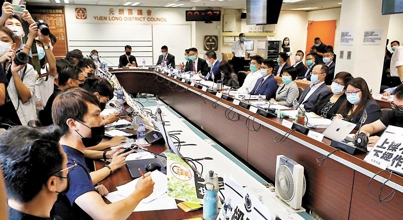 黑暴期間,區議會由諮詢性的區域組織,淪為“反中亂港”的平台。香港文匯網圖片 反中亂港人士大舉進入區議會,懶理民生,阻礙工程撥款、在會議期間唱“港獨”歌曲、發動臨時動議無理要求政府官員離開會議廳、會上無理要求“撤回香港國安法”、無理反對特區政府推行普及社區檢測及健康碼等。他們惡意推倒過往正常的民生建設,肆意幹擾政府施政,不但損害市民的福祉,破壞香港利益,更利用平台進行“煽暴煽獨”的宣傳表演,對國家安全構成嚴重威脅。