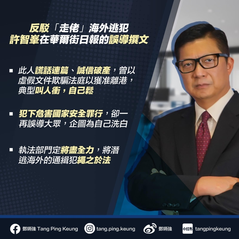 香港新聞網7月11日電 香港保安局局長鄧炳強昨日(10日)致函《華爾街日報》,批評該報刊登警方國安處懸紅通緝8名反中亂港分子之一的許智峯,所撰寫的誤導文章,指文章是對香港特別行政區及中華人民共和國的公然侮辱,更批評許智峯為“沒有信譽的騙子”,重申執法部門將會盡全力,將潛逃者緝拿歸案。