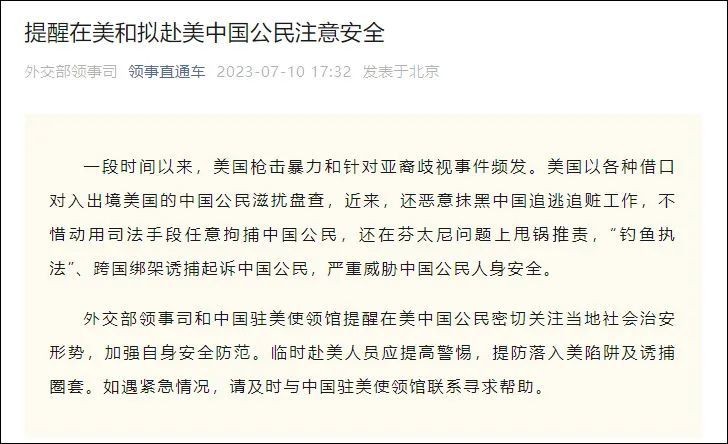 香港新聞網7月12日電 本周以來,中國外交部、中國駐美大使館接連發消息提醒在美和擬赴美中國公民注意安全。