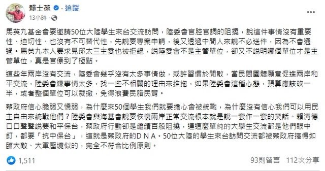 賴士葆發文痛斥陸委會官僚作風。圖源:賴士葆臉書 陸委會宣稱非主管單位後,隨後教育部作為陸生訪台團的專案審批部門開始“登台表演”。教育部發函預定交流的政治大學、文化大學、台灣大學、台灣科技大學、東華大學等5校,要求大學提出“師生維安計畫”,說明學校是否已同意接待,以及接待規劃、如何確保活動順利進行等事宜,才決定是否同意放行,讓五校傷透腦筋。馬英九基金會認為此舉是把陸生當成大敵,無限上綱安全問題。 “行政院長”陳建仁在接受媒體聯訪時表示,兩岸在疫情後健康永續交流是必要的,且希望朝正向方式進行,但也呼籲相關邀請單位,能在活動規畫中強調自由民主的認識,以及對台灣的認識,並且減少作為大陸統戰的工具。此言一出立刻引發輿論風波。