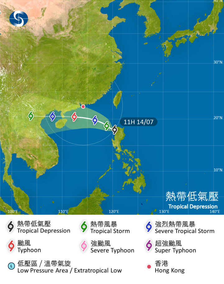 在正午12時,該熱帶低氣壓集結在東沙之東南約480公里,預料向西北偏西移動,時速約8公里,橫過南海北部,並逐漸增強。天文台表示,按照現時預測路徑,該熱帶低氣壓今日(14日)與本港保持一段距離。預料該熱帶低氣壓會在未來兩三日逐漸增強,大致移向廣東西部至海南島一帶。至於會否發出更高的熱帶氣旋警告信號,視乎該熱帶氣旋與珠江口的距離及會否顯著增強。