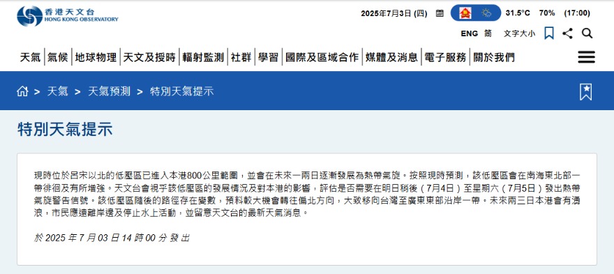 香港新聞網7月14日電 位於呂宋附近的低壓區已增強為熱帶低氣壓,並位於香港800公里範圍內。香港天文台表示,會視乎該熱帶低氣壓的移動及發展,在明日(15日)早上考慮發出一號戒備信號。